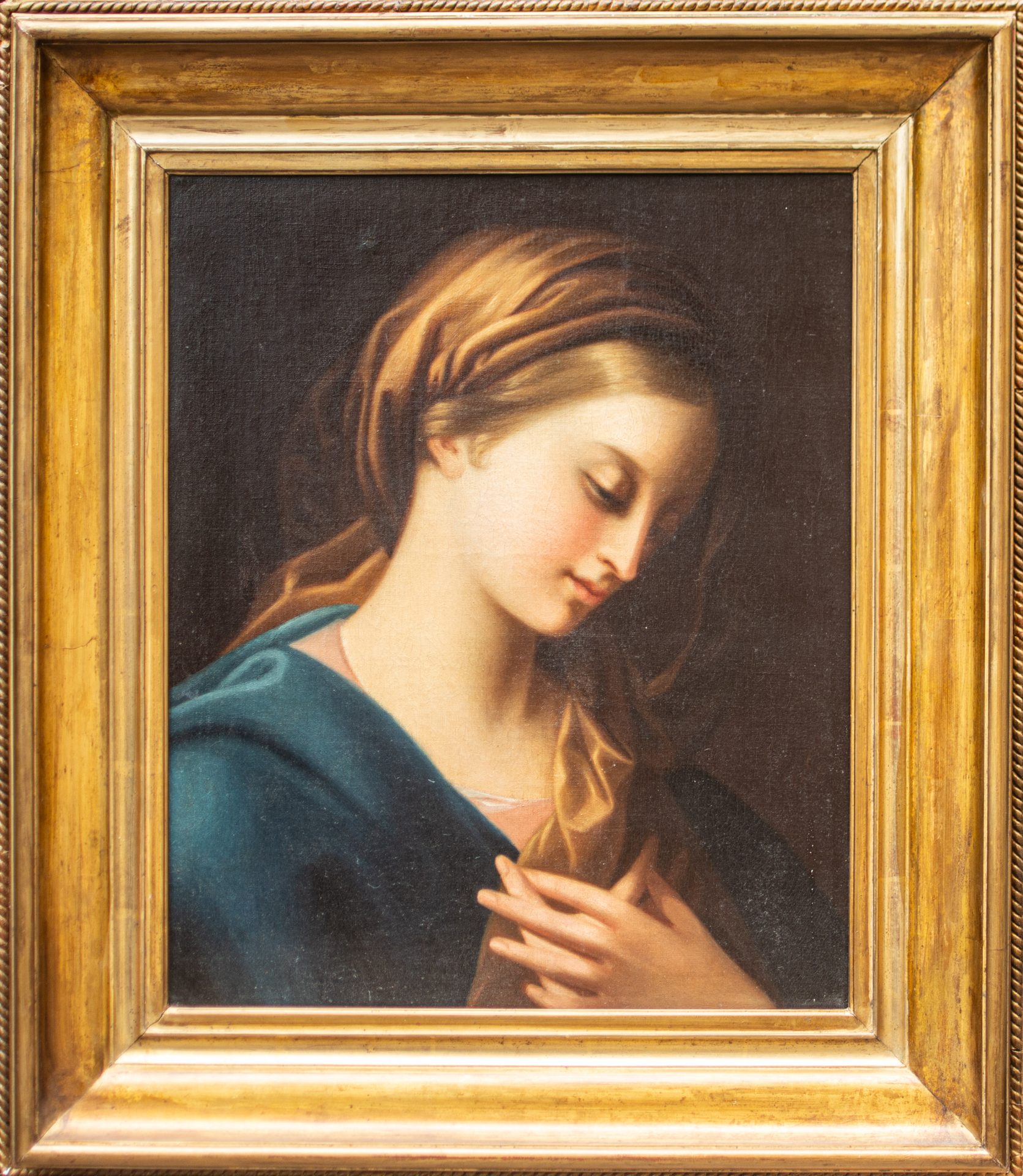 Fecioara Maria în momentul Bunei Vestiri, înfățișată cu ochii plecați și mâinile încrucișate peste piept într-un gest de umilință și acceptare.